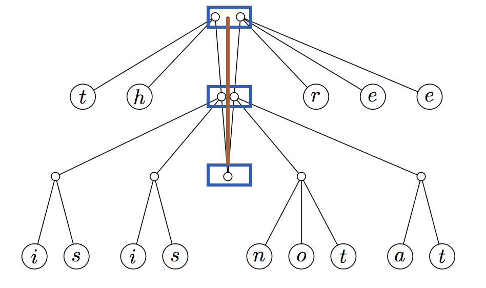 這種新的數據結構被稱為手指樹。手指樹由沿其樹脊(棕色線)分佈的幾層(下方藍色框)組成: