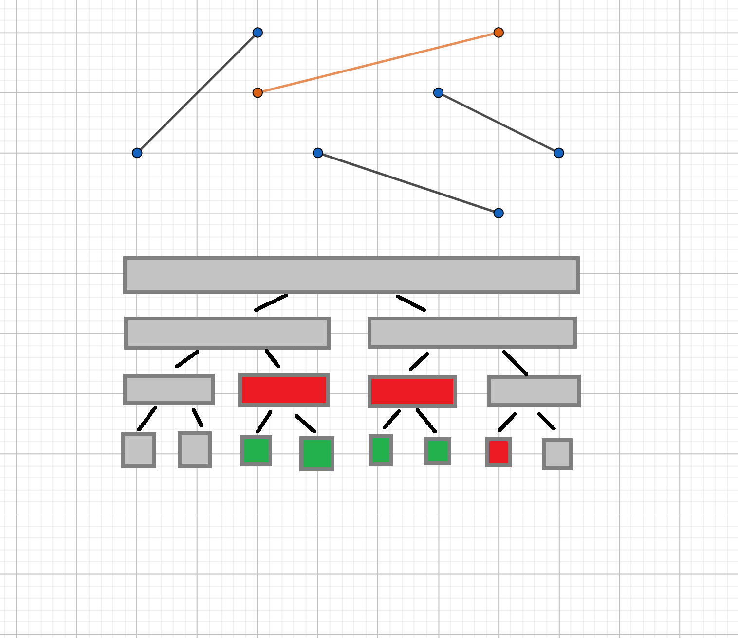 如圖,加入黃色線段後,只有紅色節點的標記被更新,而綠色節點的標記還未被改變。但在第二、三、四個綠色區間的中點處顯然黃色線段取值最大。