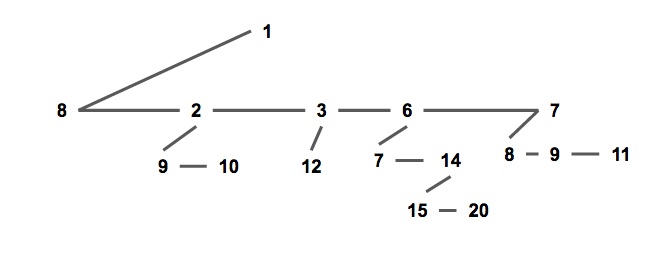 通常我們使用兒子 - 兄弟表示法儲存一個配對堆(如下圖),一個節點的所有兒子節點形成一個單向鏈表。每個節點儲存第一個兒子的指針,即鏈表的頭節點;和他的右兄弟的指針。