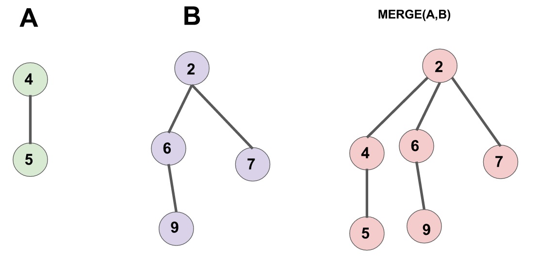 合併兩個配對堆的操作很簡單,首先令兩個根節點較小的一個為新的根節點,然後將較大的根節點作為它的兒子插入進去。(見下圖)