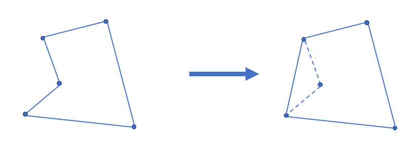 凸包用最小的周長圍住了給定的所有點。如果一個凹多邊形圍住了所有的點,它的周長一定不是最小,如下圖。根據三角不等式,凸多邊形在周長上一定是最優的。
