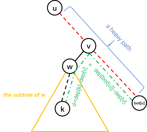 根據長鏈剖分的性質,\(k-2^i \le 2^i \leq d\) , 也就是説,我們可以 \(O(1)\) 在這條重鏈的表格上求出的這個節點的 \(k\) 級祖先。