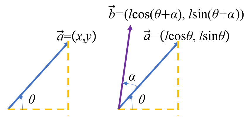 設 \(\boldsymbol a=(x,y)\),傾角為 \(\theta\),長度為 \(l=\sqrt{x^2+y^2}\)。則 \(x=l\cos \theta,y=l\sin\theta\)。令其逆時針旋轉 \(\alpha\) 度角,得到向量 \(\boldsymbol b=(l\cos(\theta+\alpha),l\sin(\theta+\alpha))\)。