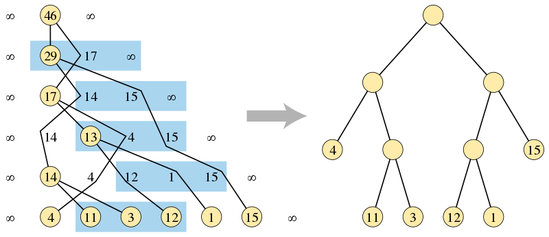 如上圖所示,在算法的第一階段,通過查找合併輸入序列的無序三元組構建的二叉樹(左側),和算法輸出的正確排序的二叉樹,其中葉子高度與另一棵樹一樣。