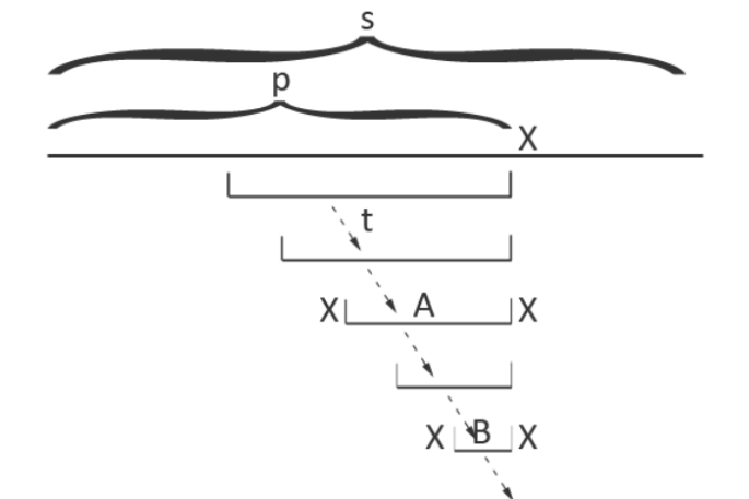 我們通過跳 fail 指針找到 A 所對應的節點,然後兩邊添加 X 就到了現在的迴文串了(即 XAX),很顯然,這個節點就是以 \(p\) 結尾的最長迴文子串對應的樹上節點。(同時,這個時候長度 \(-1\) 節點優勢出來了,如果沒有 X 能匹配條件就是同一個位置的 \(s_p=s_p\),就自然得到了代表字符 X 的節點。)此時要判斷一下:沒有這個節點,就需要新建。