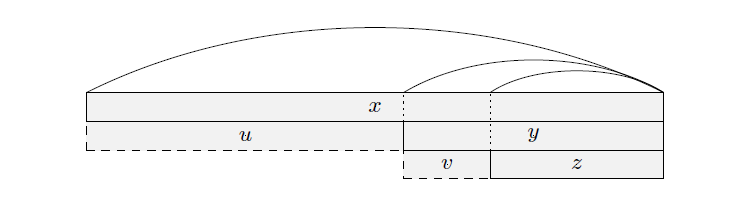 - 因為 \(y\) 是 \(x\) 的 border,所以 \(v\) 是 \(x\) 的前綴,設字符串 \(w\),滿足 \(x=vw\)(如下圖所示),其中 \(z\) 是 \(w\) 的 border。考慮反證法,假設 \(|u| \le |z|\),那麼 \(|zu| \le 2|z|\),所以由引理 \(2\),\(w\) 是迴文串,由引理 \(1\),\(w\) 是 \(x\) 的 border,又因為 \(|u| > |v|\),所以 \(|w| > |y|\),矛盾。所以 \(|u| > |z|\)。