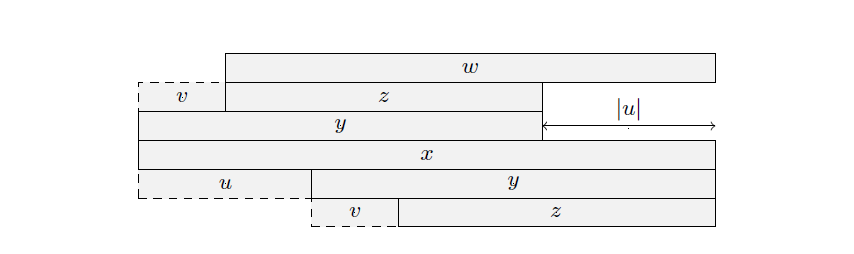 - 由引理 \(3\) 的推論,\(|u|=|x|-|y|\) 是 \(x\) 的最小週期,\(|v|=|y|-|z|\) 是 \(y\) 的最小週期。考慮反證法,假設 \(|u| < |v|\),因為 \(y\) 是 \(x\) 的後綴,所以 \(u\) 既是 \(x\) 的週期,也是 \(y\) 的週期,而 \(|v|\) 是 \(y\) 的最小週期,矛盾。所以 \(|u| \ge |v|\)。