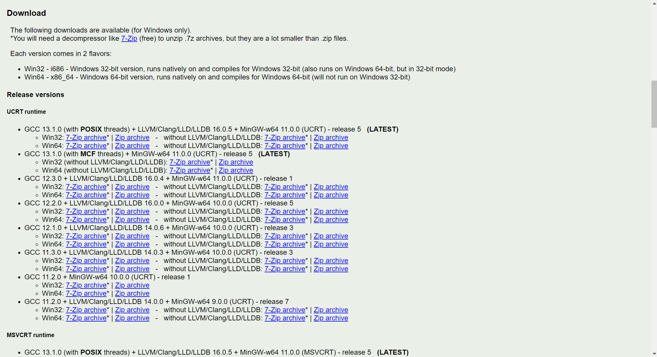 首先前往 WinLibs 下載最新的安裝包,選擇合適的版本,本文選擇了 GCC 12.3.0 + LLVM/Clang/LLD/LLDB 16.0.4 + MinGW-w64 11.0.0 (UCRT):