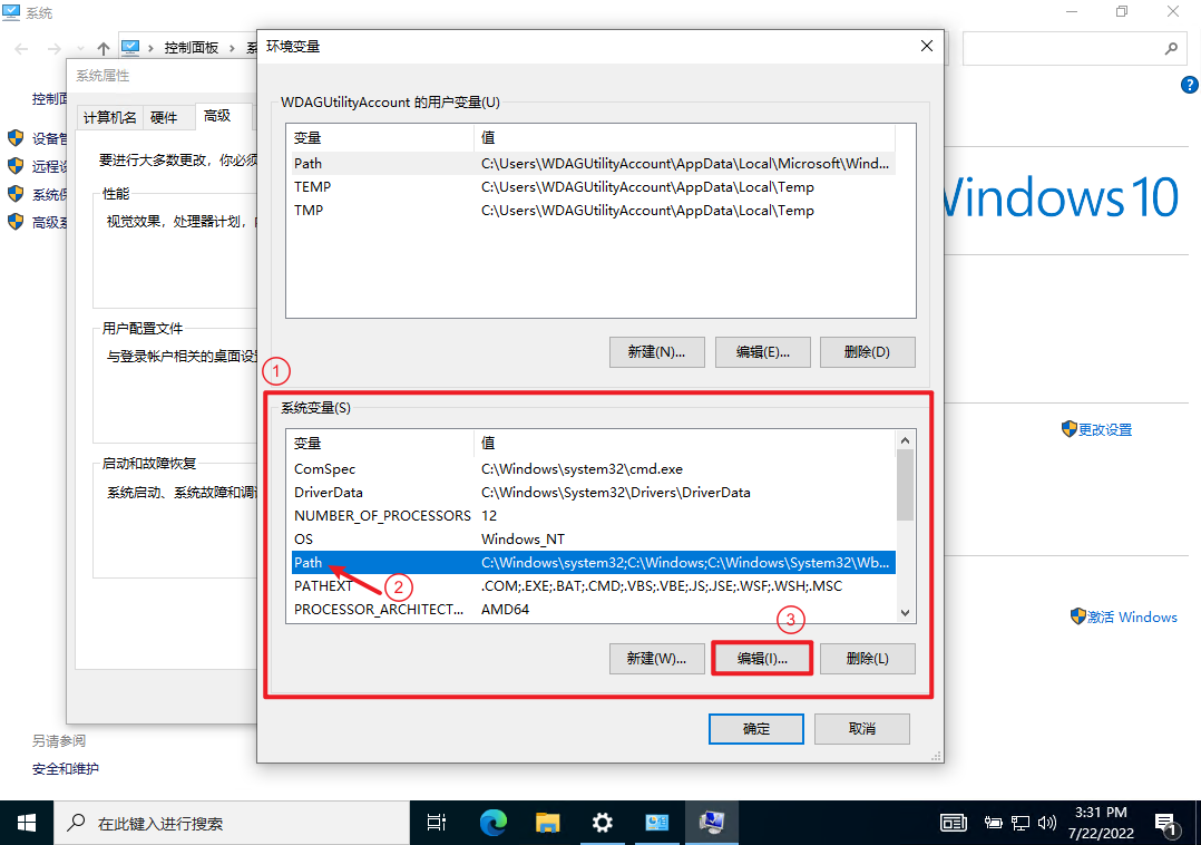 按下 Windows 徽標 + R 組合鍵,輸入 rundll32.exe sysdm.cpl,EditEnvironmentVariables,打開系統環境變量設置窗口,並在「系統變量」一節中選中名為「Path」的變量,然後點擊「編輯」按鈕: