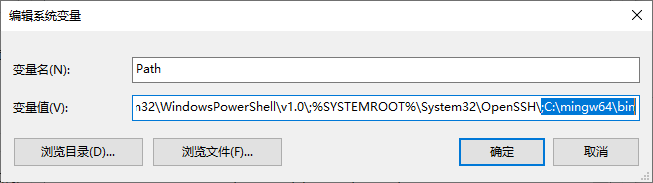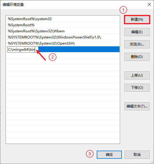 在編輯窗口中點擊右側的「新建」按鈕,為「Path」變量新建一個條目,並填入上文中記錄下的可執行文件所在的目錄(教程中為 C:\mingw64\bin)。