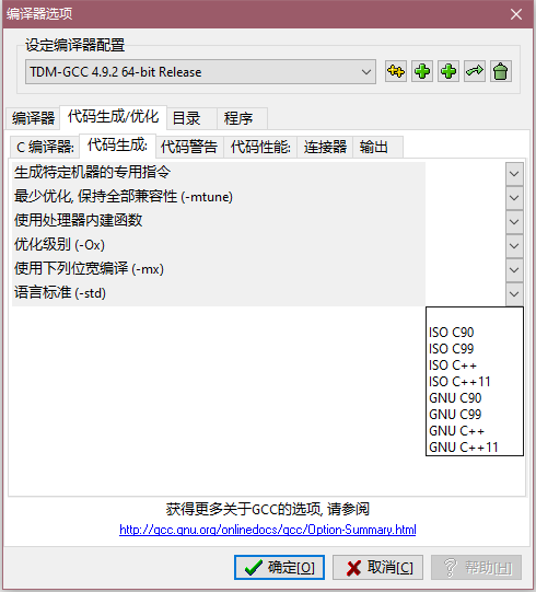 選擇 "代碼生成" 子選項卡中的 "語言標準(-std)" 選項標籤。