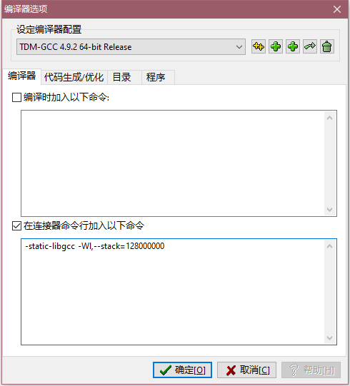 在 "連接器命令行加入以下命令" 中加入 -Wl,--stack=128000000 命令。