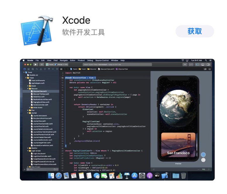 打開蘋果電腦自帶的 App Store(或者嘗試 快捷鏈接)下載 Xcode。點擊獲取,然後輸入蘋果賬號密碼開始下載安裝。