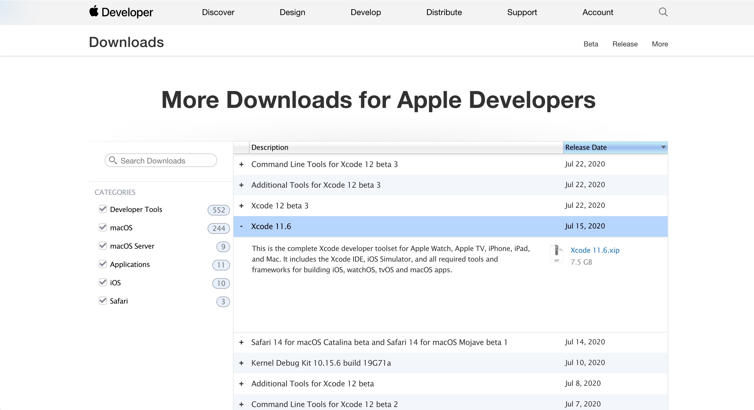訪問 蘋果開發者下載頁面,用蘋果賬號登錄,然後找到 Xcode 最新的穩定版本安裝包(即不含 Beta 的最新版本,此處為 11.6):