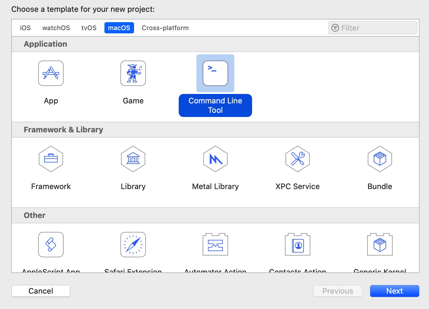 點擊 Create a new Xcode project(創建一個新的 Xcode 項目),然後選擇上方 macOS 中的 Command Line Tool(命令行工具),並點擊右下角的 Next