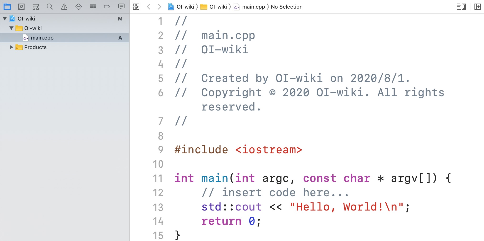 項目的目錄可以根據需要選擇。創建完畢後,Xcode 會自動打開這個項目,並自動創建一個 main 文件(C 語言的後綴為 .c,C++ 語言的後綴為 .cpp)。