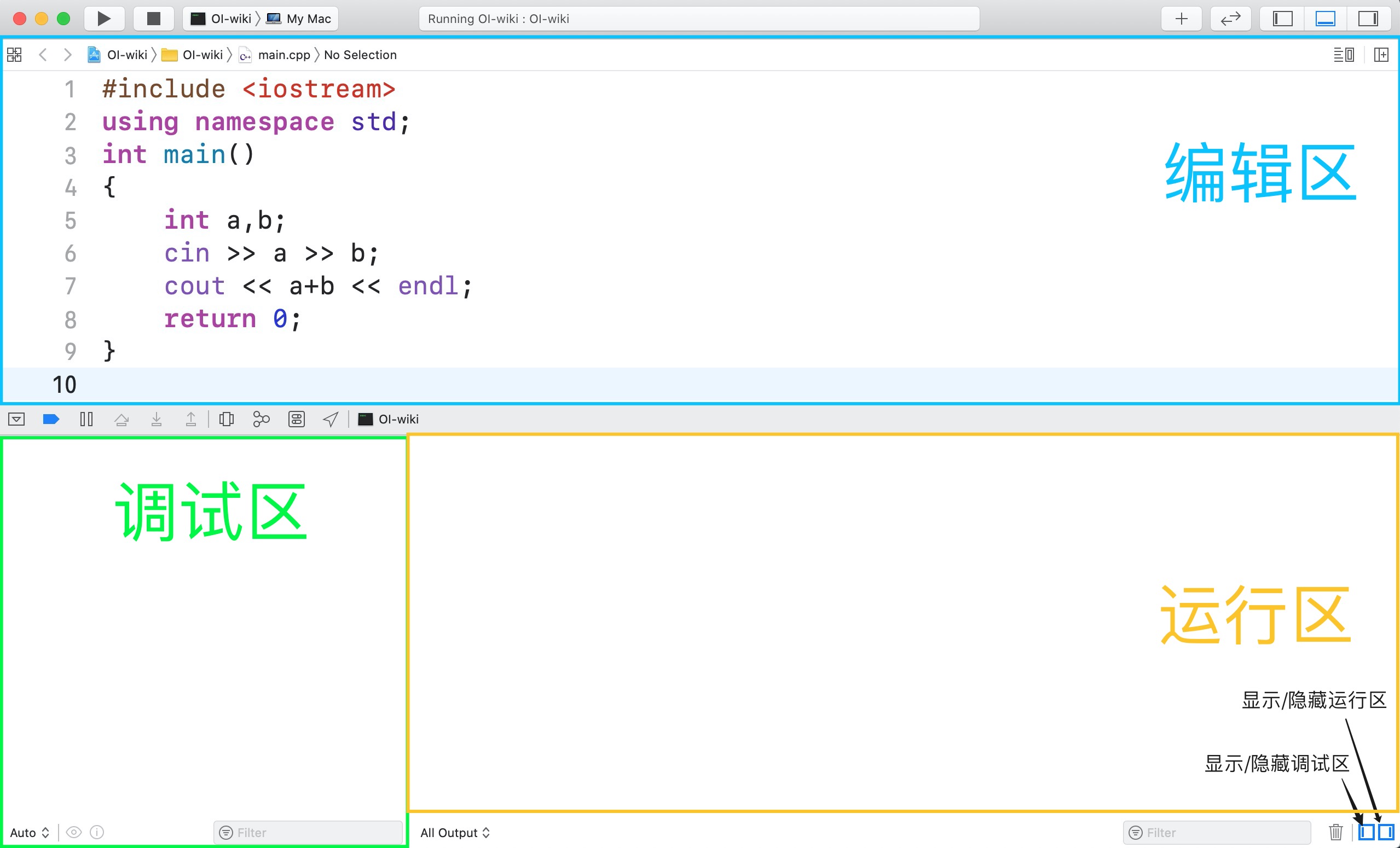 一般來説我們只使用【編輯區】和【運行區】。若程序有輸入,那麼在【運行區】中進行輸入之後,就可以得到輸出。界面呈現效果: